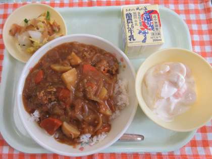 今日の献立は、麦ごはん、カレーライス、福神和え、フルーツヨーグルト、牛乳です。
