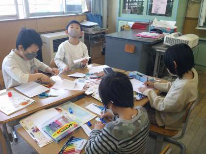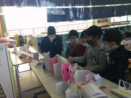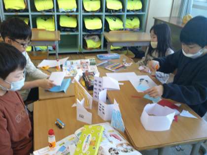 紙を折って立てて色々なもを作りました。富士山や称名滝、宮野小学校、ねこ、虹など、たくさんのものができました。広い机の上に並べたら楽しい世界が広がりました。