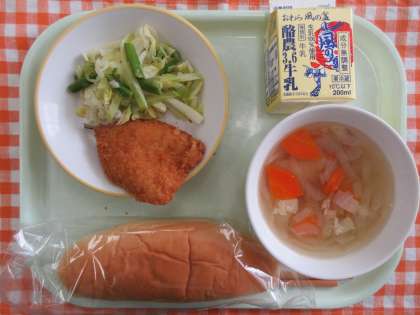 今日の献立は、コッペパン、あじフライ、アスパラサラダ、ポテトスープ、牛乳です。