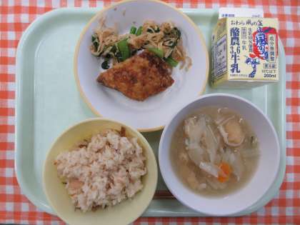 今日の献立は、五目ごはん、若菜の蒲焼き、ハリハリ和え、みそ汁、牛乳です。