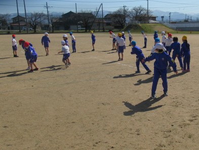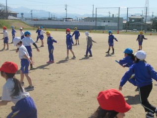今日の体育科では、バトンパスの練習をしました。今までは、リング状のバトンでしたが、棒状のバトンに変わりました。渡し方を習って練習しました。