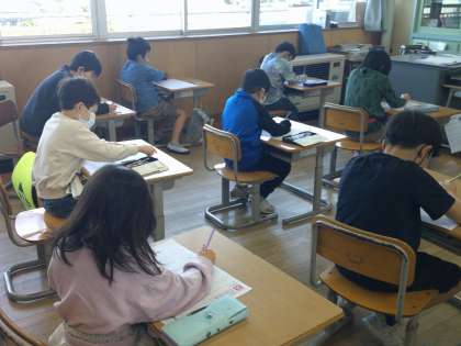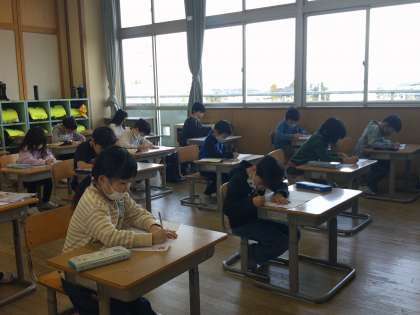 1年で習った漢字は80字。正しく書けるか力試しのテストに真剣に取り組む子供たちです。