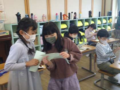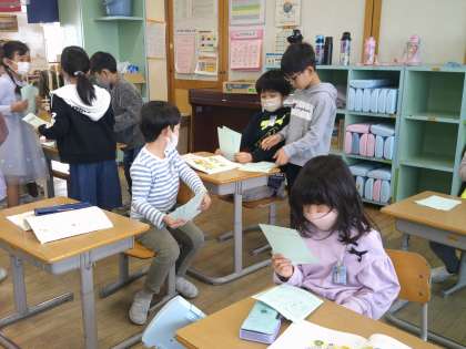 クラスメイトのよいところや頑張りを見付けてカードに書き溜めてきました。今日はそのカードを本人に渡しました。友達から褒めてもらったり、自分の気付いていなかったよさを見付けてもらったりして、心がほかほかになった子供たち。嬉しそうにカードを読んでいました。