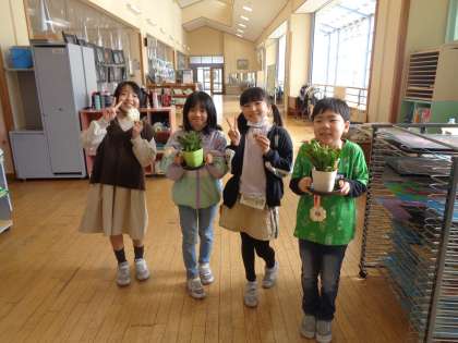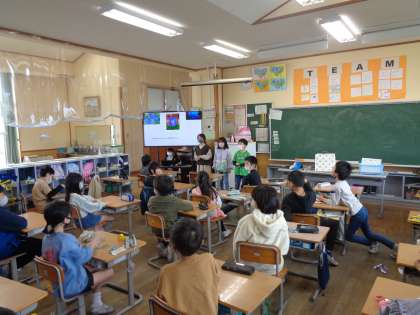 業間に、係が企画した植物クイズを行いました。クイズは、スライドに上手くまとめていました。クイズが終了するとみんなにメダルを渡しました。無事大成功に終了し、係のメンバーで一枚パシャリ。