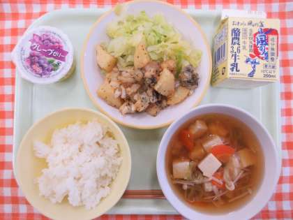 今日の献立は、ごはん、魚とじゃがいものえごまみそからめ、ゆでキャベツ、すまし汁、牛乳です。