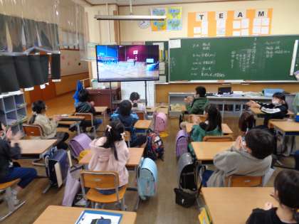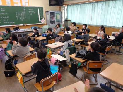 画面越しでは、ありますがお世話になった6年生の最後の晴れ姿を見届けました。写真は、6年生が退場する最後の最後まで拍手を送っている様子です。