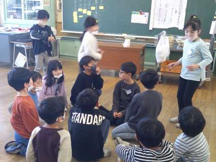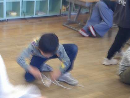 給食を食べ終わった後の昼休み、声をかけ合ってハンカチ落としをしたり、ひもの上を、回っているコマを渡らせようと何回も挑戦したりして、楽しい時間を過ごしました。