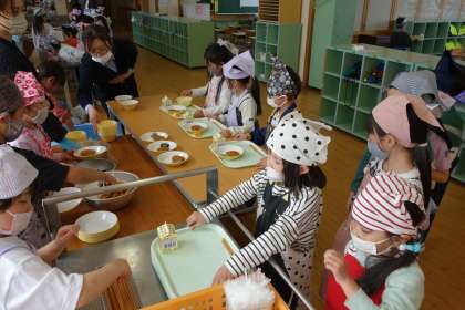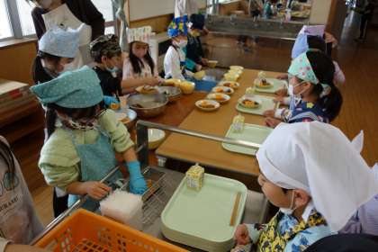 給食準備の様子です。先生の話を聞いて、しっかりと準備を進めることができました。