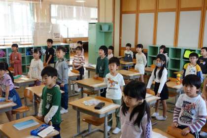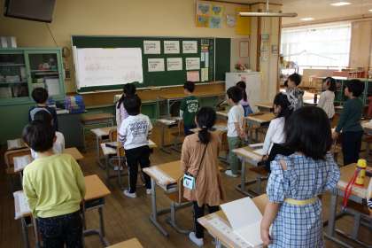 朝の歌で宮野小学校の「校歌」が流れました。歌詞を見ながら、校歌を歌ってみました。練習して上手に歌えるようになるといいですね。