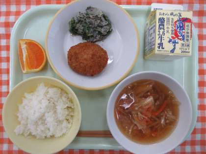 今日の献立は、ごはん、豆とカボチャのコロッケ、よごし、沢煮椀、清見オレンジ、牛乳です。