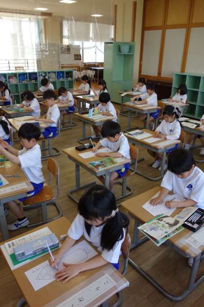 自分の名前を丁寧に書いています。「枠の中に入るように書く」「字の大きさを揃える」「まっすぐに書く」自分たちで見付けたポイントに注意して、集中して書くことができました。