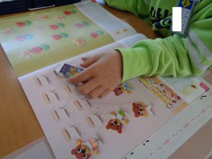 算数の学習では、どちらの数が多いのかを学習しています。椅子と熊を線で結んでどちらが余ったかでどちらが多いのかを考えています。椅子と熊の場所が遠いと線で結ぶのが難しいことにも気付き、「ブロックを使って考えたい」という声も聞かれました。