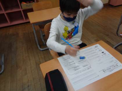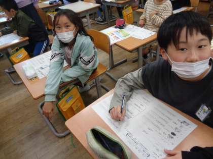 外国語活動では、ローマ字に挑戦しました。3年生のときに学習したローマ字とは、また違った、ヘボン式ローマ字に取り組みました。頭をかかえながら、友達と学習できました。