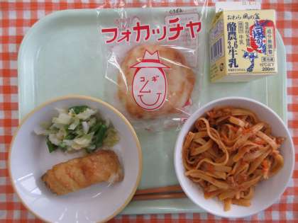 今日の献立は、フォカッチャ、ホキのイタリアンレモンソースがけ、グリーンアスパラのコントルノ、ラグーアッラボロネーゼ、牛乳です。
