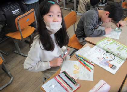 虫眼鏡をつかって、種の大きさや色、特徴をじっくり調べました。