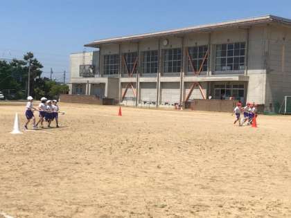 今日は、始めて外で台風の目の練習を行いました。どのようにしたら早くゴールできるか相談しながら練習を行いました。