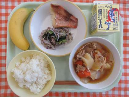 今日の献立は、ごはん、赤魚の塩焼き、ゆかり和え、豚肉とジャガイモのうま煮、バナナ、牛乳です。