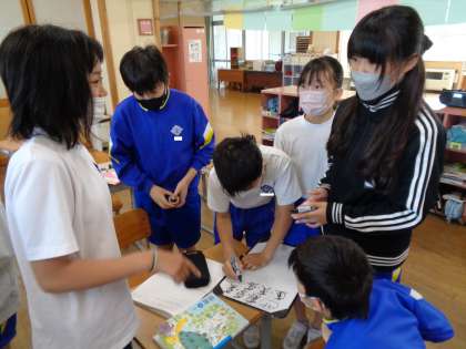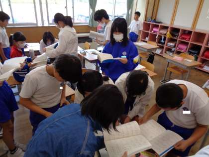 国語の学習で、漢字の部首にそれぞれ意味があることを学習しました。グループで、同じ部首の漢字探しをしました。みんなで学び合っています。