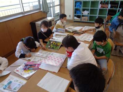 今日は、自分が決めた野菜に実がなるまでしっかりと育てるために、どのように育てればいいのか、何に気を付ければ良いのかを班ごとに本で調べました。大切に育てたいという意欲が高まっています。