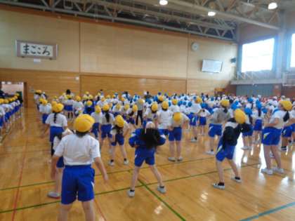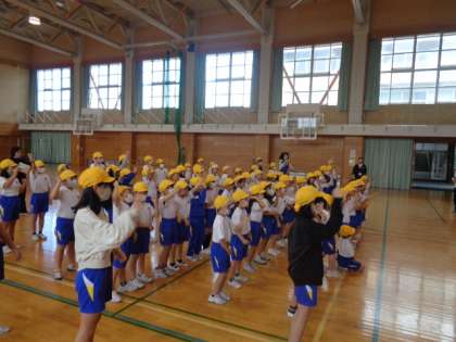 午前中は雨だったため、体育館で開会式の練習と、応援練習を行いました。