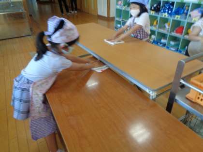 給食準備の時間の様子です。毎週交代で給食当番さんが給食の盛りつけなどの準備をしてくれています。盛りつけるだけでなく、片付けにも積極的に取り組んでおり、素早く準備をして給食を食べることができています。