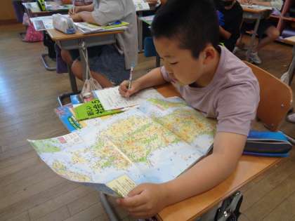 社会科では、日本の山地について調べました。地図帳を開きながら、集中して取り組んでいました。