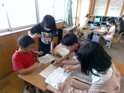 班対抗で漢字辞典を使って漢字しりとりに挑戦。