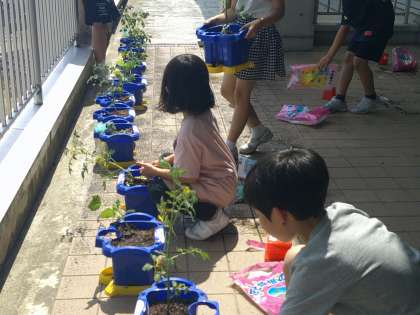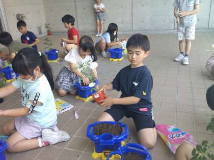 いろいろな葉の形をした数種類の苗の中から、自分の選んだ野菜の苗はどれかを、しっかり見極めて手にとり、一人一人鉢に植えました。これからの成長を楽しみにしていました。