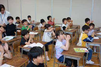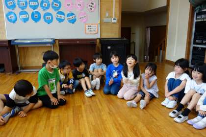 音楽科の様子です。リズムに合わせて、果物の名前を言います。少しずつ上達してきました。