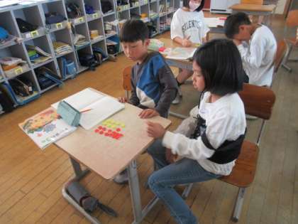 今日の算数科の学習では、おはじきを使って割り算の考え方を説明し合いました。