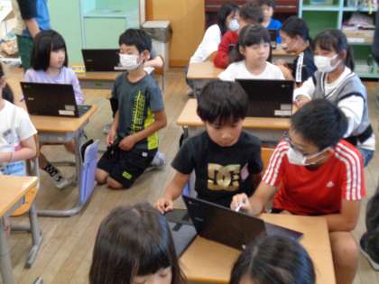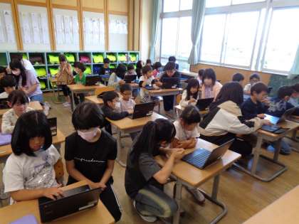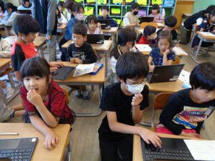 1年生のクロームブックログインとアンケート調査のお手伝いをしました。「ここを押してね」「この質問についてはどう?」など、優しく声をかけるすてきな姿がたくさん見られました。
