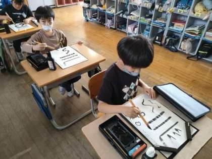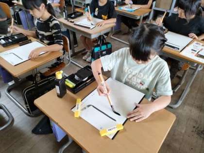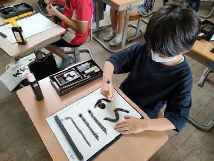 習字セットの準備も整い、毛筆の学習が始まりました。今日は、毛筆の基本(ベイシック)を学びました。「用具の準備」「姿勢」「筆の持ち方」「腕の動かし方」「用具の片付け」…のBasic5です。子供たちは、筆を下ろすこと、硯に墨液を入れること、筆に墨液をつけること…一つ一つの動作にどきどきわくわくしていました。これからの毛筆の学習も、今日の緊張感を忘れずに取り組んでいきます。