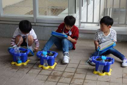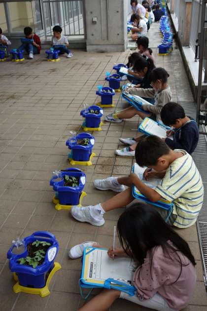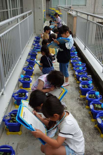 アサガオの芽の観察を行いました。「たくさん芽が出てうれしい」「早く大きくなってほしい」などと、互いの思いを聞き合うことができました。