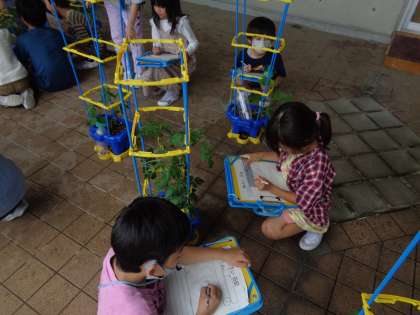野菜を植えてから一週間以上が経ちました。心を込めて一生懸命に水やりをしたため、すくすく育っています。成長の早さに驚きながら、特徴を丁寧に絵や文で表しました。