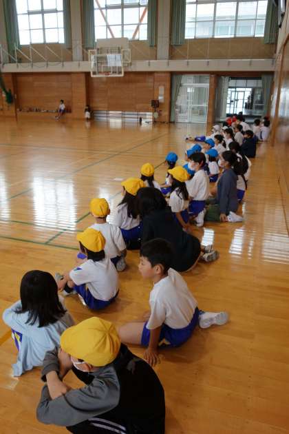 今日は、6年生と一緒に体育。シャトルランの測定に6年生が協力してくれました。