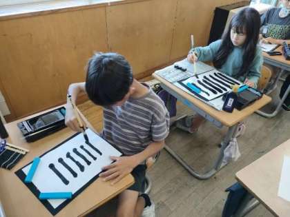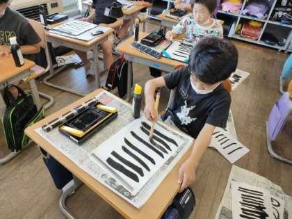 毛筆で、横画の学習をしました。穂先を左斜め上に向け「トン、スー、トン」のリズムで筆を運びます。今日は、横画をたくさん書きました。来週は、今日の練習を生かして「二」を書く予定です。