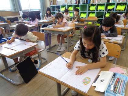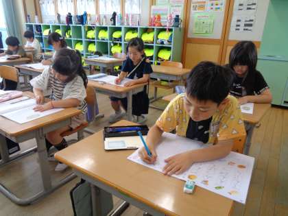 ひらがなの学習も終わりに近づいてきました。今日は今までに習ったひらがなでひらがな表を作ったり、濁点の付くひらがなを学習したりしました。細かな「とめ、はね、はらい」にも気をつけて丁寧に書いています。