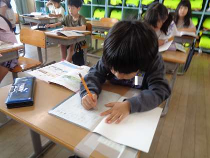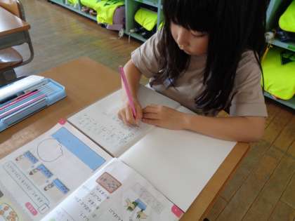 算数科でもノートを使っての学習が始まりました。教科書の問題を見て足し算の式を丁寧にノートに書いています。