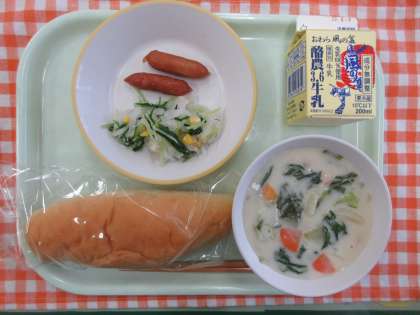 今日の献立は、コッペパン、あらびきウインナー、水菜のサラダ、クリーム煮、牛乳です。
