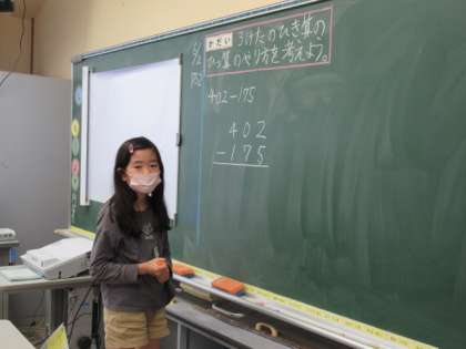今日の算数科では、繰り下がりが二つあるひき算の筆算の計算の仕方を考えました。