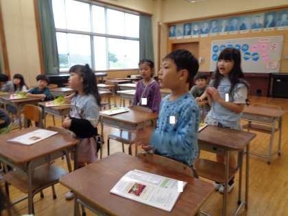 音楽の学習では、今までに習ったことを生かして、歌とカスタネットを使ったミニ発表会を行いました。初めての発表会で緊張した様子でしたが、口を大きくあけて歌うことやリズムを感じながらカスタネットをたたくことに気をつけて発表しました。