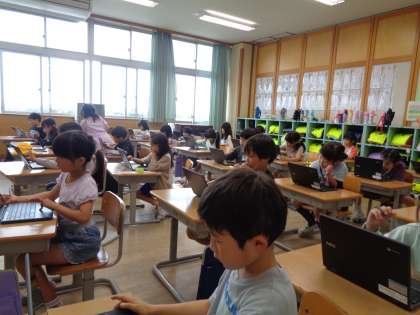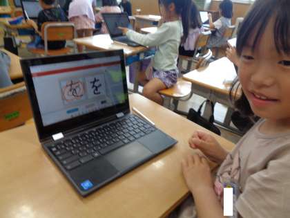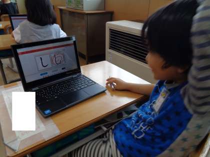 クロムブックを使ってさまざまな学習に取り組んでいます。今日は、ひらがな練習に取り組みました。丁寧に書かないとなかなか花丸がもらえないということもあり、何度も何度も繰り返し練習していました。最後には、「はなまるもらえた。」「3個もはなまるだった。」など喜びの声も飛び交っていました。