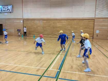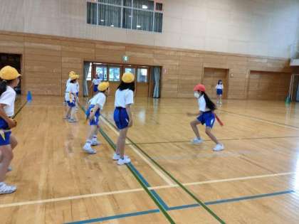 今、体育科では、ボール運動の「ゴール型ゲーム」に向けて、学習を進めています。今日は、タグを腰に着けて取り合うタグ取りゲームを行いました。相手チームを交わしながら、向こう側まで通り抜けるスリル満点のゲームに、子供たちは夢中になって取り組みました。この学習は、この後、ボールを扱う「タグラグビー」や「フラッグフットボール」につながります。