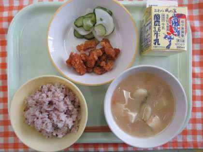 今日の献立は、雑穀入りごはん、イカのかりん揚げ、二色ピクルス、すいとん、牛乳です。
