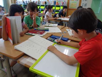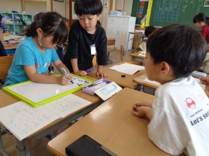 見つけた濁点の付く言葉をグループのみんなと共有しています。ノートを見せ合って、どんな言葉があるかを確認した後は、グループごとにホワイトボードに見つけた言葉を書きました。濁点の付く言葉はたくさんあることを学んでいました。