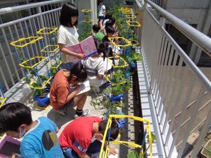 「観察名人になろう」の学習では、観察をするときに大切なポイントを学び、それを生かして自分の育てている野菜の観察を行いました。臭いをかいだり、触ったりするなどそれぞれが丁寧に観察し、ノートにまとめていました。