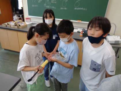 自分たちの呼気に含まれる空気の成分を調べました。酸素が減って、二酸化炭素が増えていることから、私たちは呼吸を通して酸素を体内に取り入れていることに気付きました。