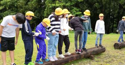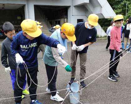 5年生と6年生の混合チームで、いろいろなチャレンジを行います。チームワークだけでなく、知恵も必要な活動です。さぁ、いくつのコーナーがクリアできるでしょうか?