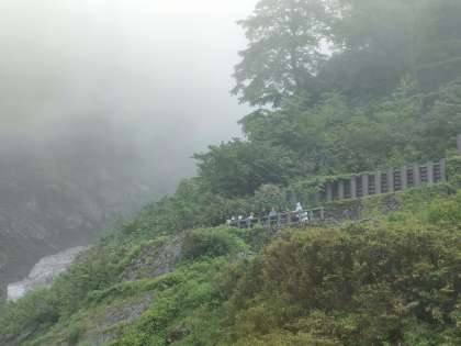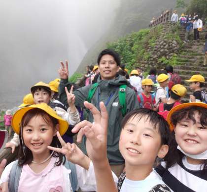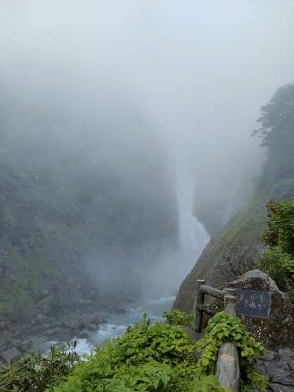 自然の家を出て、最後の活動、称名滝の見学に行きました。小雨の中で霧がかかっていましたが、ハンノキ滝と称名滝の絶景を満喫することができました。