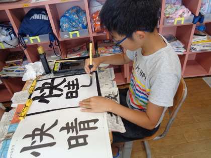 点画のつながりを意識して、「快晴」の練習をしました。お手本をよく見て、ていねいに書きました。